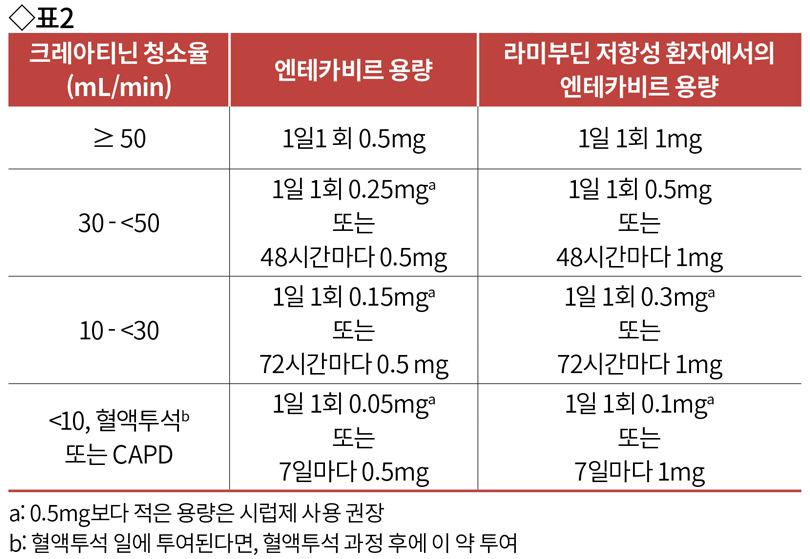 라미부딘 저항성 환자, 즉 라미부딘 치료에도 불구하고 B형간염바이러스의 지속적 증식을 경험했거나, 라미부딘 저항성 변이가 있는 16세 이상의 환자는 1일 1회 공복 시 엔테카비르로서 1mg을 투여한다.