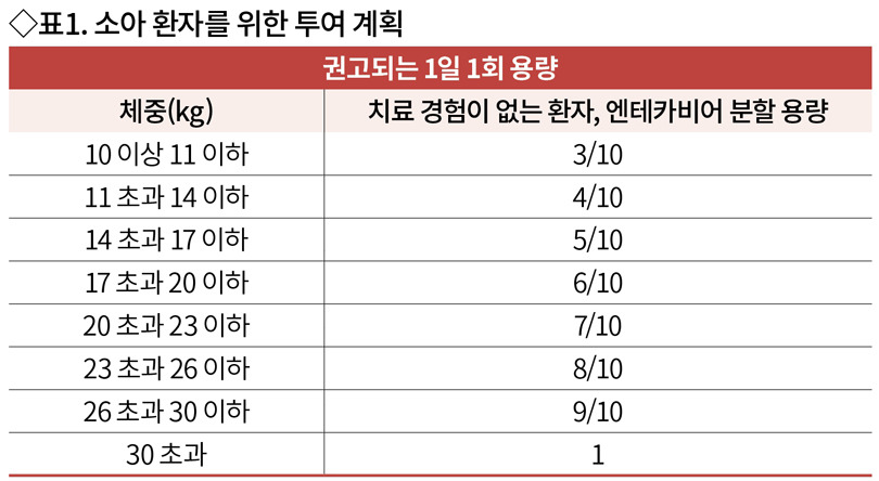 1일 1회 엔테카비르로서 0.5mg을 경구투여한다.