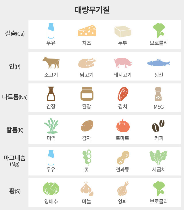 - 주요 종류: 칼슘(Ca), 인(P), 나트륨(Na), 칼륨(K), 마그네슘(Mg), 황(S), 염소(Cl)